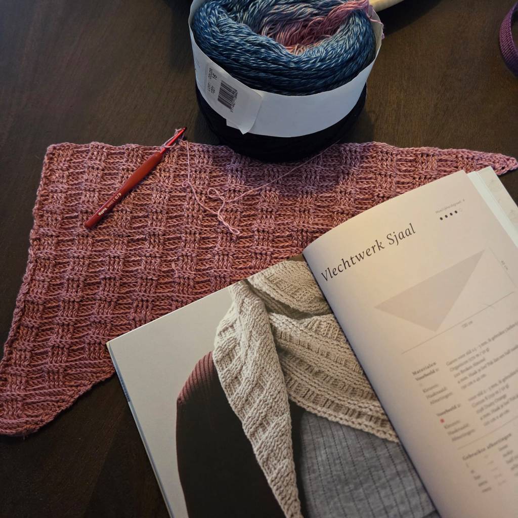 Als de Vlechtwerk sjaal af is, haak ik er misschien nog een randje omheen, omdat ik nu één kant van de sjaal minder mooi vind, maar misschien kan ik dat ook nog goed krijgen met het blokken van de sjaal.